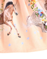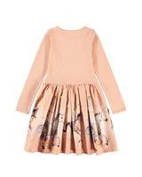 Long-sleeved cream-coloured dress made of organic cotton with a fitted ribbed top, a round neckline and a voluminous circular-cut skirt made of cotton flannel. The skirt has a print of unicorns and flowers.