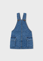 This denim pinafore dress is a charming addition to a child's wardrobe, featuring a playful all-over heart motif.