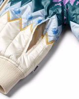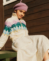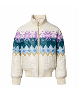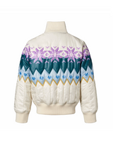 Off-white quilted jacket with Norwegian-inspired pattern in multiple colours. The jacket has a close-fitting silhouette, a front zipper, side pockets, ribbed cuffs around the wrists, neckline, and bottom.
