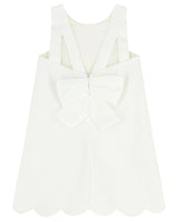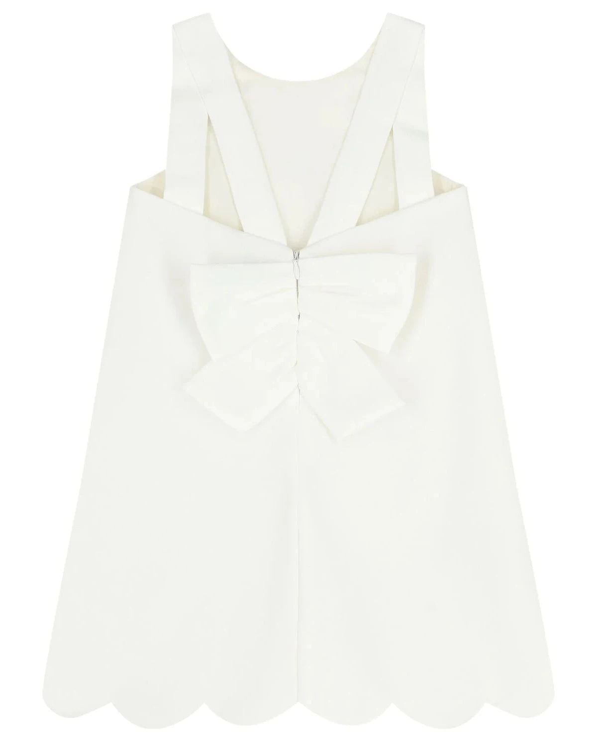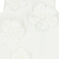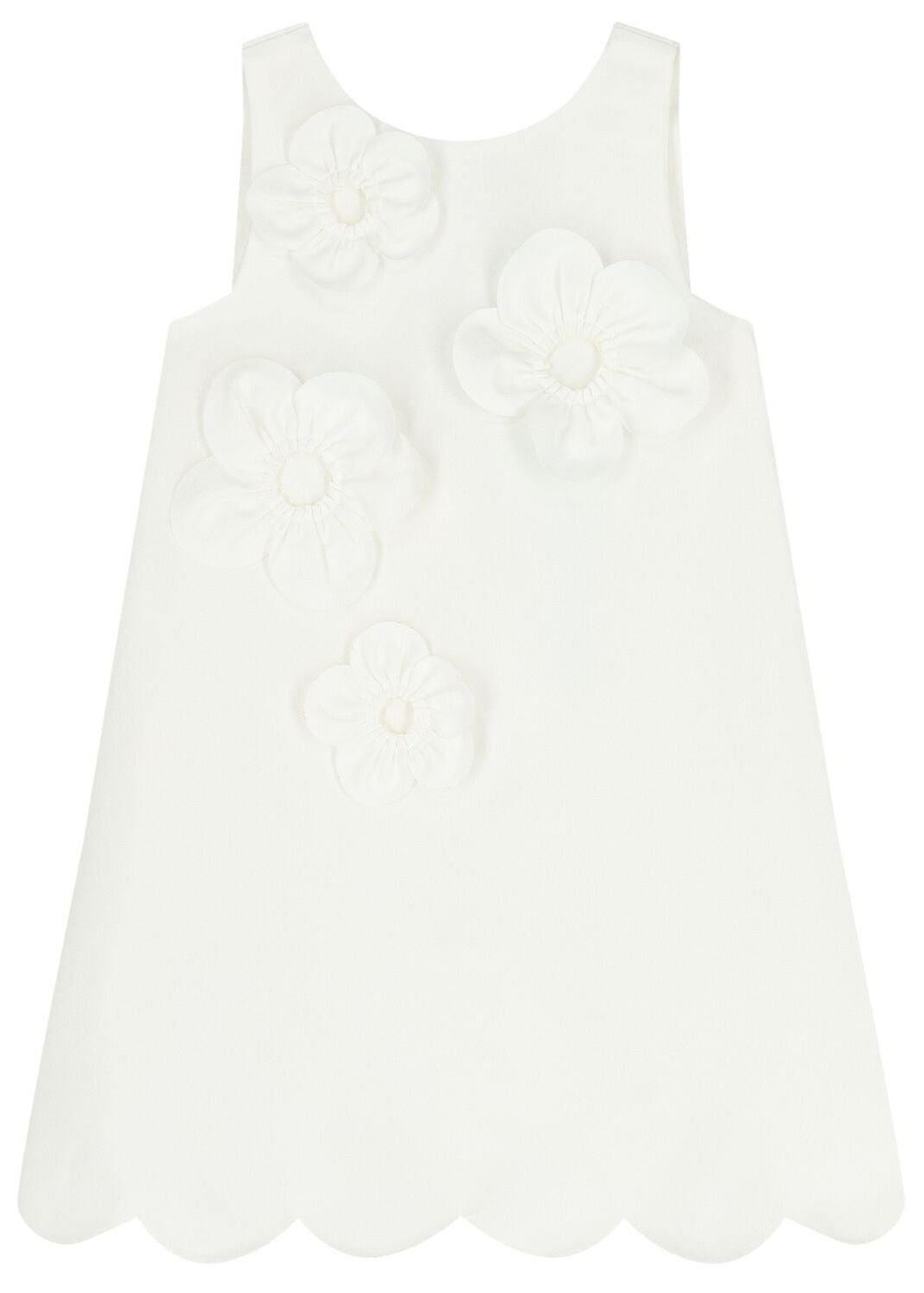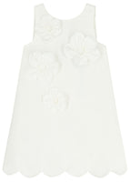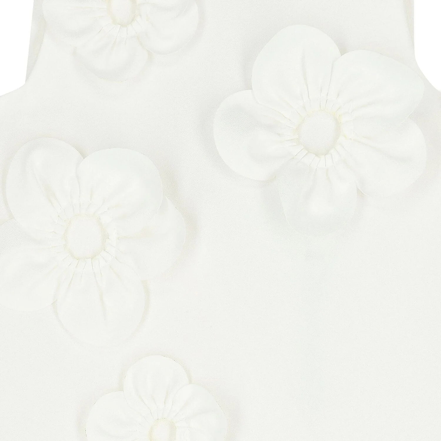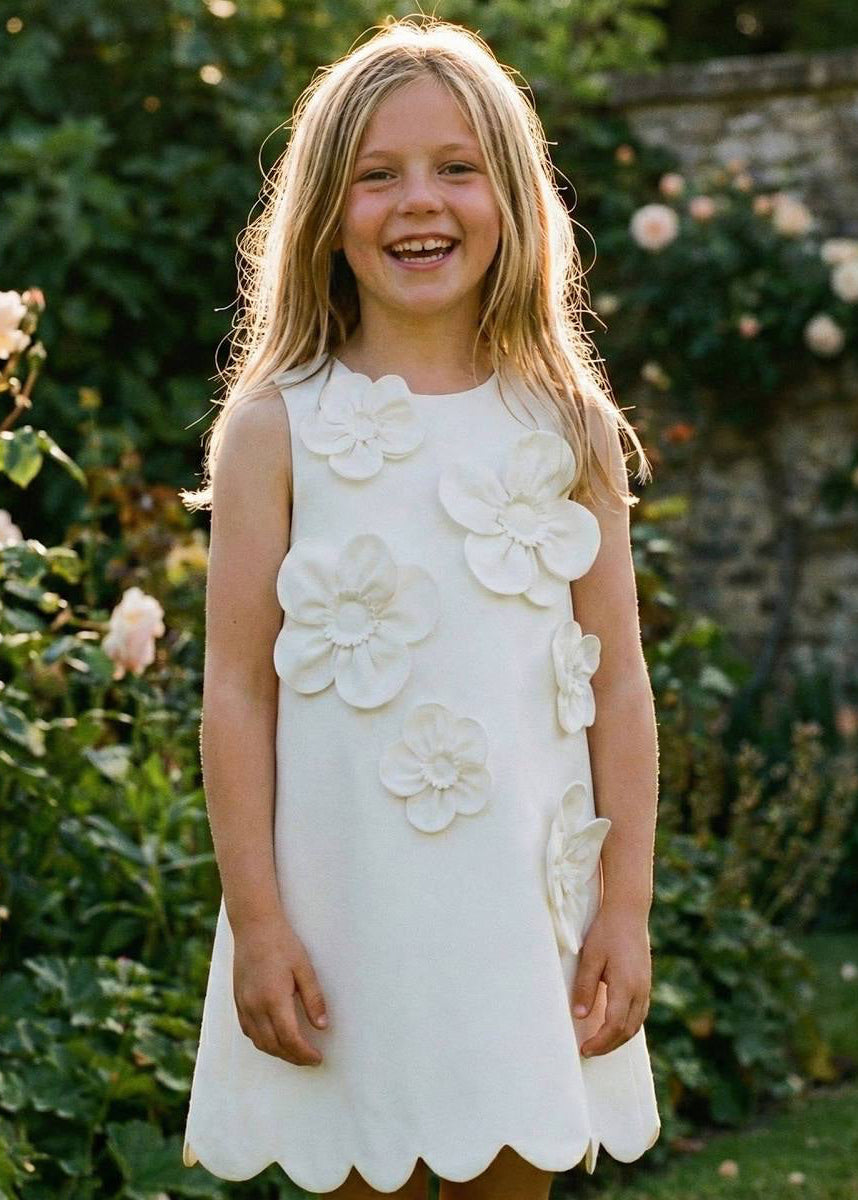 Elegant white dress for girls by Abel & Lula. Made from soft fabric, it features four 3D floral appliques across the bodice and waist for a playful yet elegant touch. The sleeveless dress has scalloped hem. The back is finished with a shallow V neckline and a large double-layered statement bow, making it a chic choice for weddings, communions, and formal celebrations.