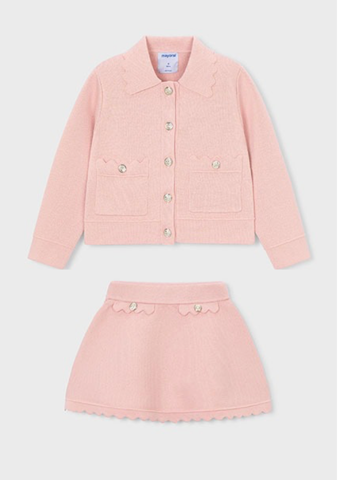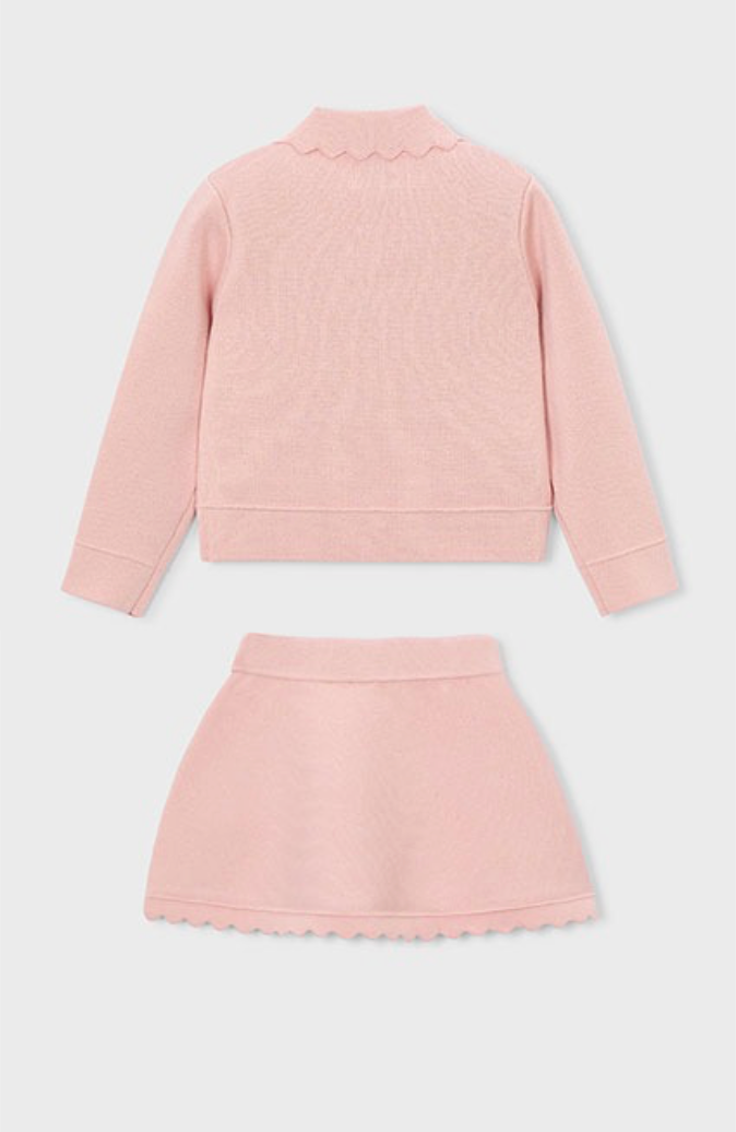 Dress her in timeless sophistication with our Pink Scalloped Knit Set. This matching ensemble features a beautifully structured cardigan and a coordinating A-line skirt, both finished with delicate scalloped edges and shimmering jewel-button accents. It’s the perfect choice for family photos, birthday parties, or any special occasion.