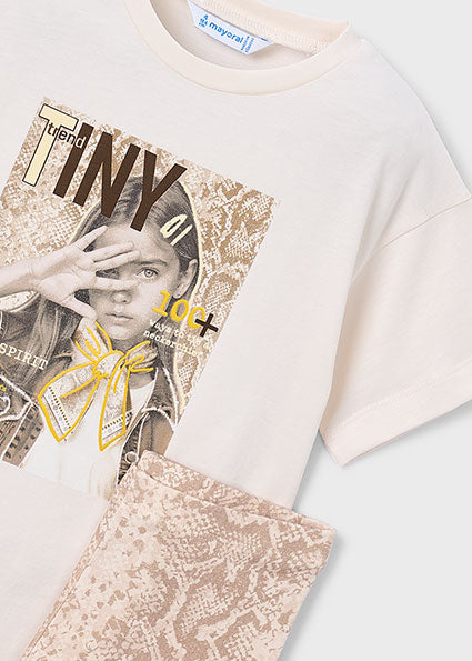 Elevate her casual wardrobe with this coordinated 2-piece set. Combining a contemporary graphic T-shirt with matching patterned leggings, this outfit offers a balanced mix of urban style and wearable comfort.