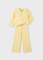 Pants: High-waisted wide-leg design with decorative vertical seams to create a tailored look.