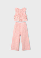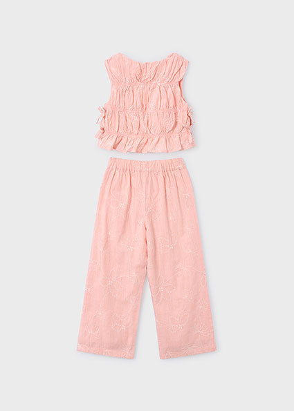 Elevate her summer wardrobe with this elegant 2-piece coordinated set. Crafted in a soft peach hue, this outfit features a sleeveless smocked crop top with delicate side-tie details and matching high-waisted wide-leg trousers. Both pieces are adorned with intricate floral embroidery, offering a breezy, sophisticated look for any special occasion or sunny day out.