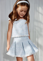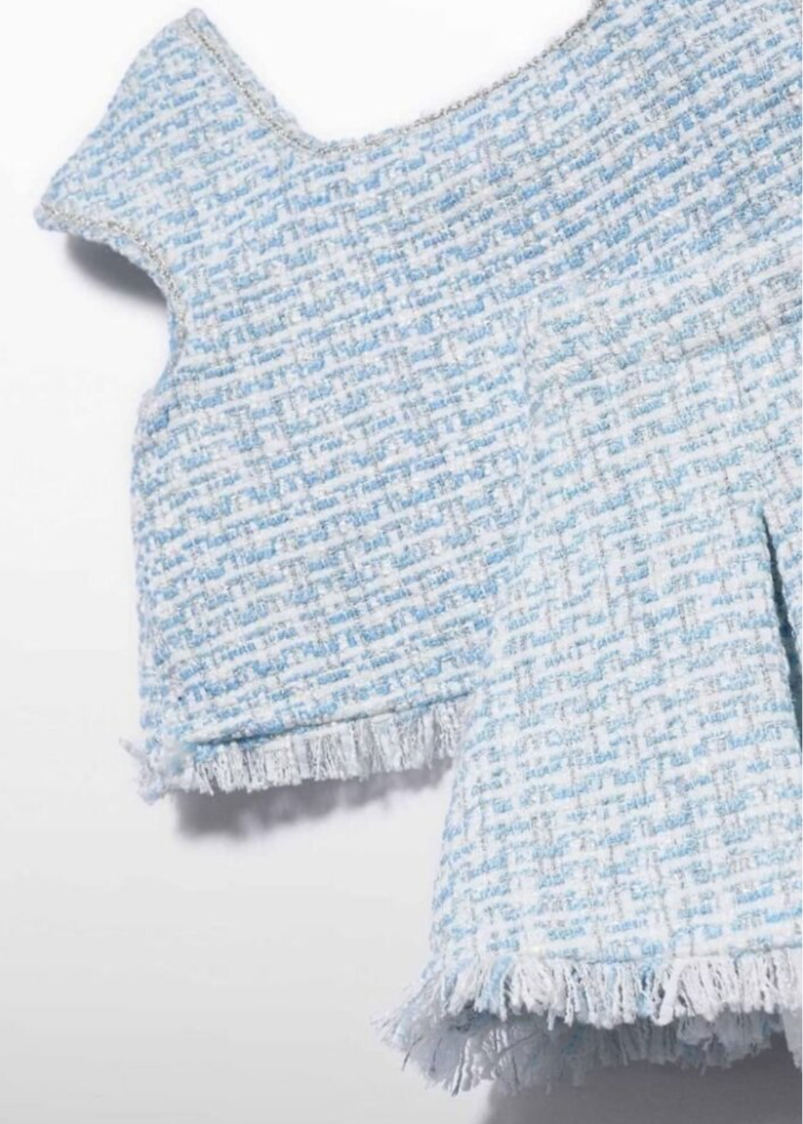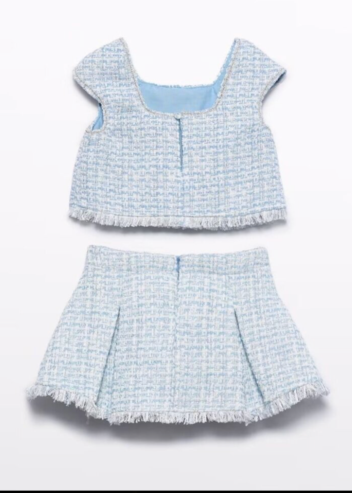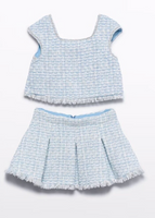 Introduce timeless sophistication to her wardrobe with this stunning tweed ensemble. This two-piece set features a sleeveless crop top with a classic scoop neckline and a matching pleated mini skirt. Crafted from a textured light blue and white tweed, both pieces are finished with a delicate frayed fringe hem for a modern, high-fashion touch.