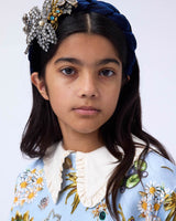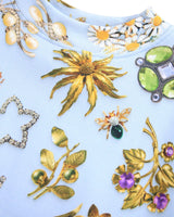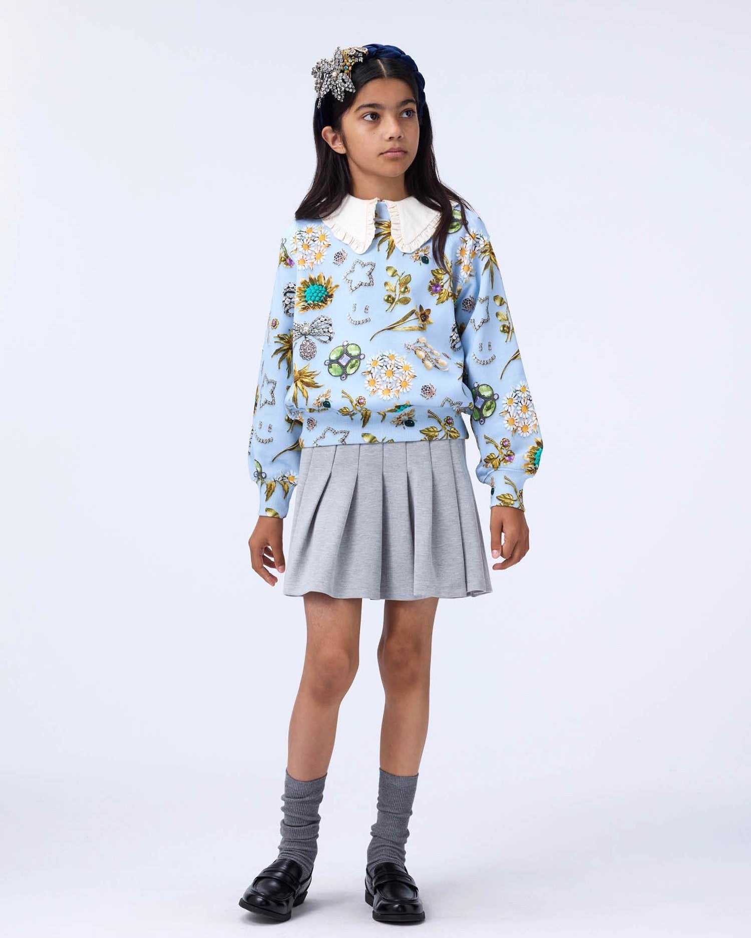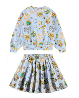 Light blue sweatshirt made of organic cotton with a round neck and ribbed edges round the neck, waist and sleeves. The sweatshirt has an oversized fit and a print of beautiful jewelry. Light blue skirt made of organic cotton with a print of beautiful jewelry. The skirt has an elastic waistband to make it easy to put on and comfortable to wear. It has a rounded cut shape that falls nicely to mid-thigh.