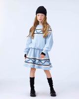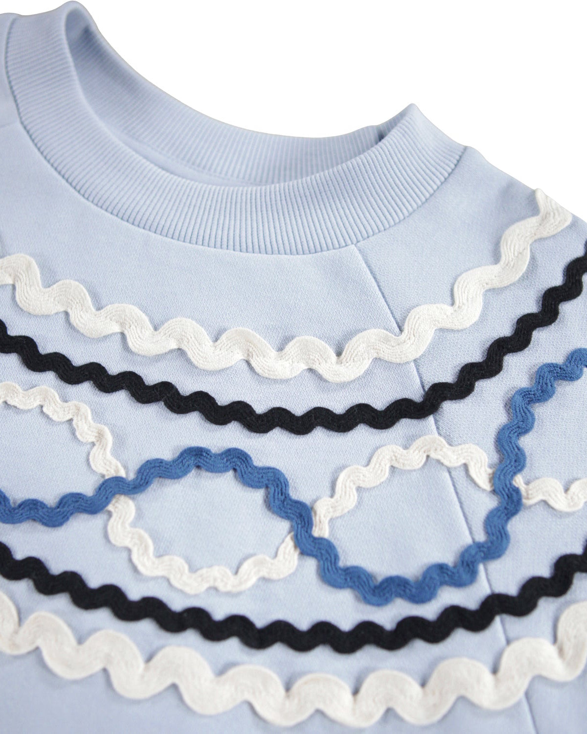 Light blue sweatshirt made of organic cotton with a colourful pattern of sewn-on ribbons. This sweatshirt has a round neck, raglan sleeves, and ribbed edges around the sleeves and bottom.Light blue skirt made of organic cotton with a pattern of colored appliquéd ribbons. The skirt has an elastic waistband to make it easy to put on and comfortable to wear. It has a rounded cut which falls nicely to mid-thigh.