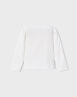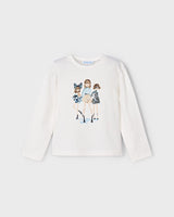 Long sleeved T-shirt for girls. Round neckline. Made from soft elasticated cotton fabric. Decorative elements: sequins. Design with doll print.