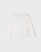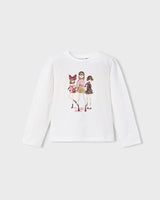 Long sleeved T-shirt for girls. Round neckline. Made from soft elasticated cotton fabric. Decorative elements: sequins. Design with doll print.