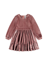 Knee-length rose velour dress with long sleeves and a V-neckline. The dress has a wide waistband for a close-fitting silhouette, while the ruffle skirt falls beautifully in the soft velour. The invisible zipper makes the dress easy to put on.