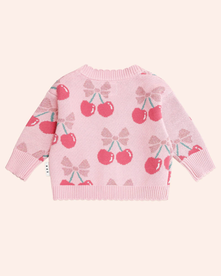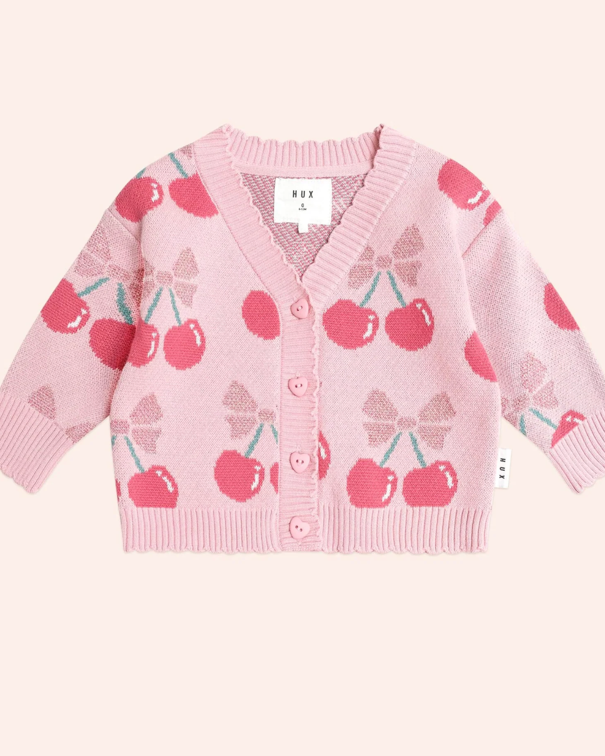 An extra special sparkly cardi. Made from luxuriously thick jacquard knit organic cotton, it has an all over cherry pie pattern in sparkly lurex, pretty scalloped edging and sweetheart buttons for easy layering.