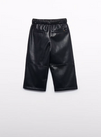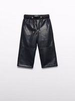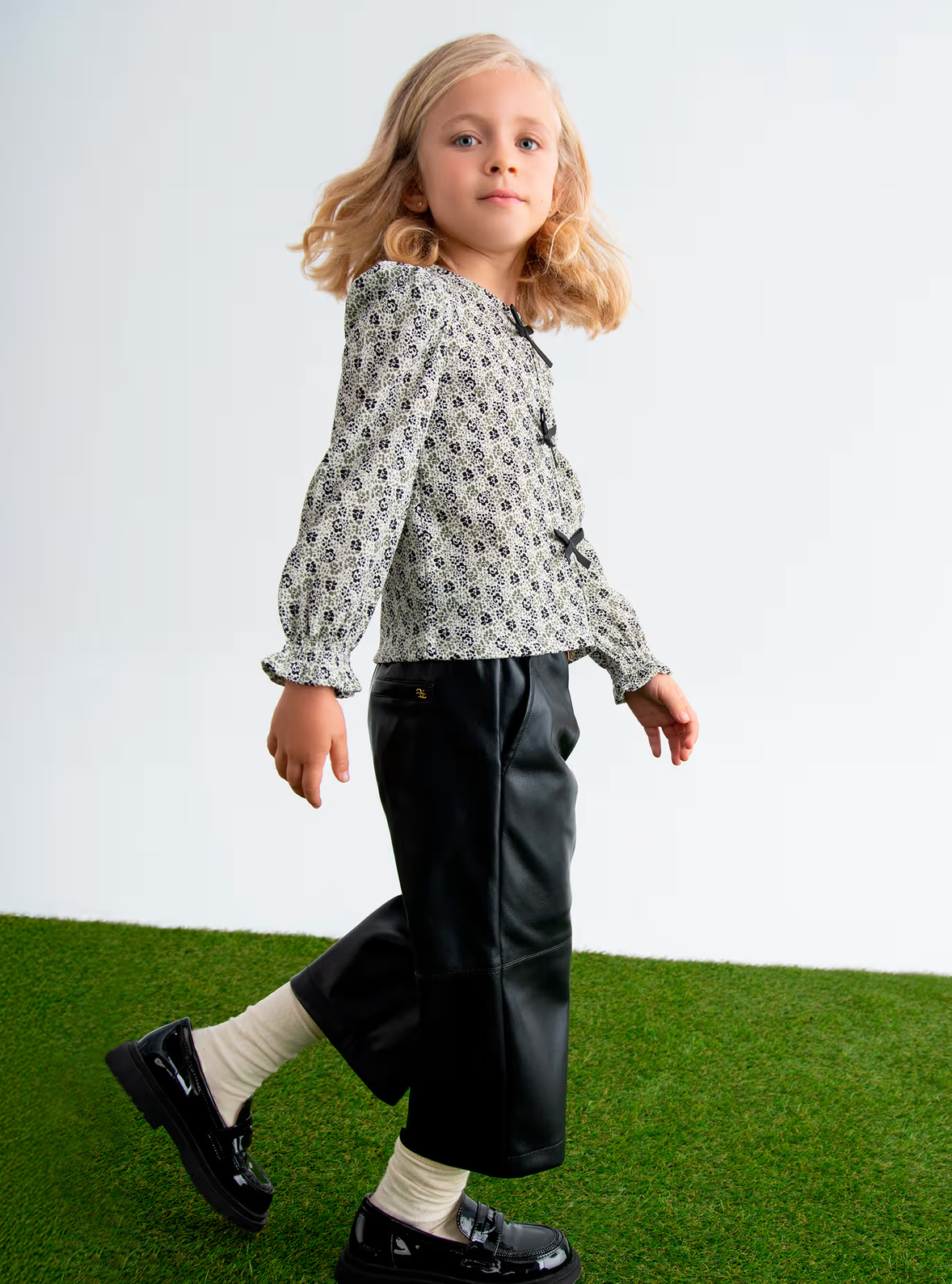 Introducing the Girls Faux Leather Culottes Trousers by Abel & Lula, a perfect blend of style and comfort for your young fashionista. These trousers feature a solid black design with a straight leg style and a button closure for a polished look. Smartly designed with pockets and a comfort fit suitable for various occasions. Care instructions recommend line drying to maintain quality.