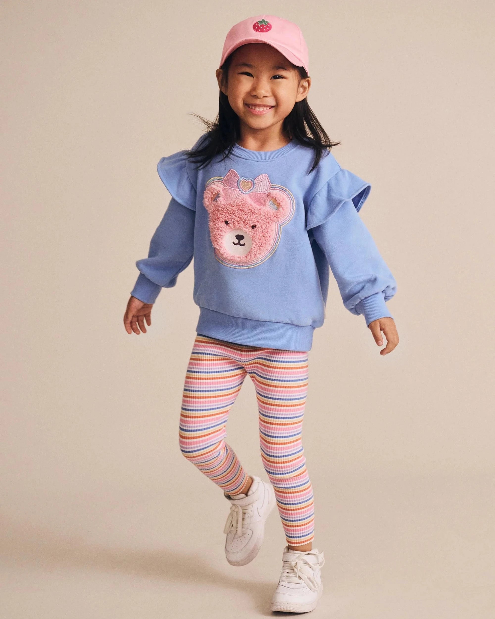 A warm and cosy fluffy terry sweatshirt, with super sweet shoulder frills. Itís made from the dreamiest organic cotton that feels like a big hug from your bestie. It features a sparkly Huxette embroidery on the tummy. Baby sizes include stainless steel back snaps for easy dressing.
