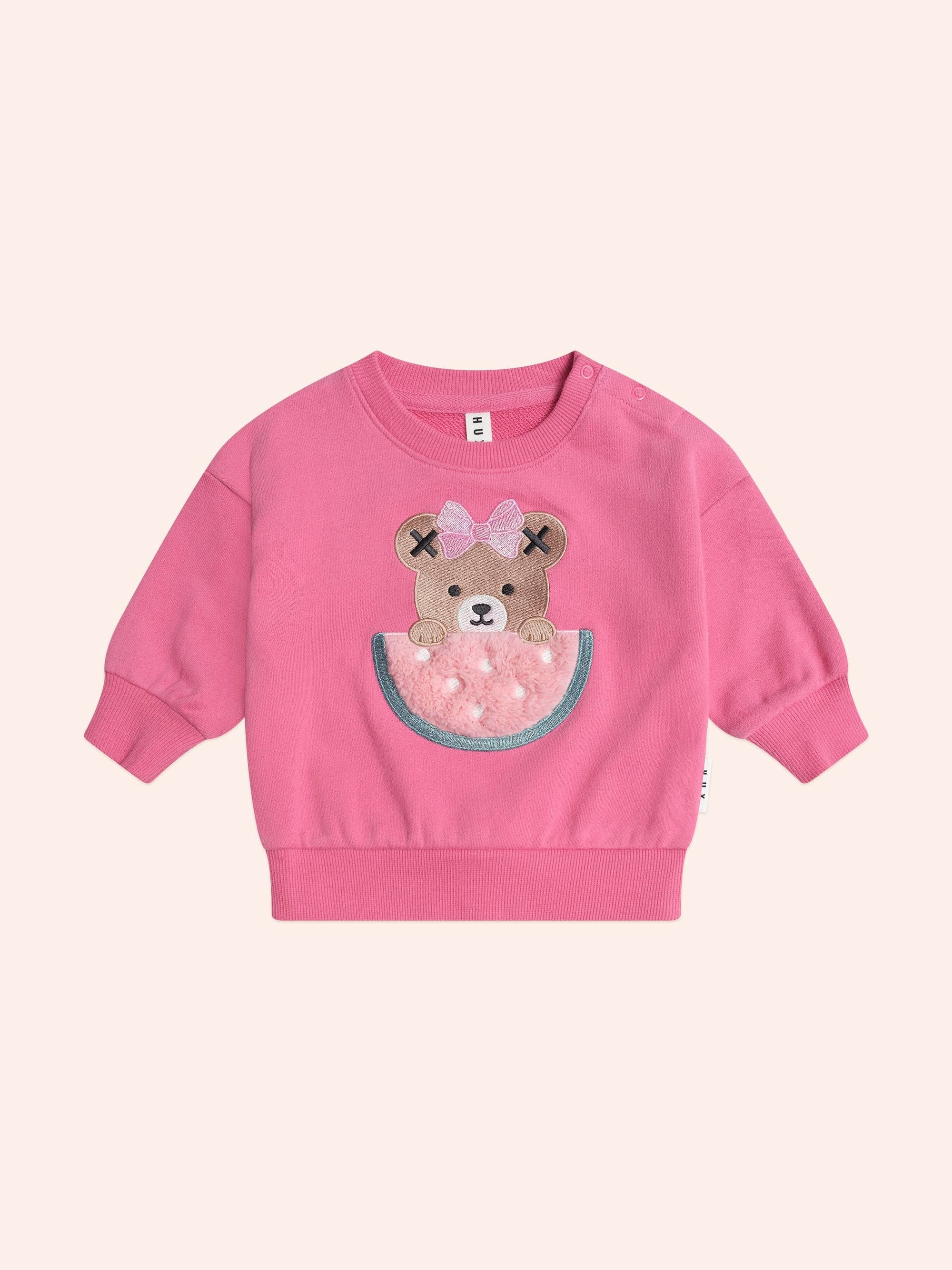 The perfect everyday sweat, but with added sparkle. This slouchy sweatshirt is made from buttery-soft organic cotton in berry pink and features a sparkly watermelon bear embroidery. Baby sizes feature stainless steel back snaps for quick changes.