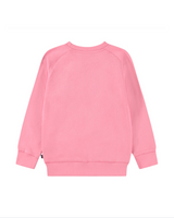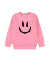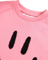 Pink sweatshirt made of soft organic cotton with raglan sleeves, ribbed edges around the neck, sleeves and waist. The sweatshirt has a loose fit with a black and soft smiling embroidery on the front.