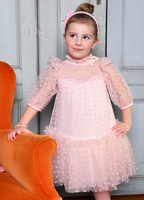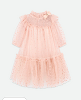 Make an entrance in this adorable blush pink heart tulle dress for girls. This voluminous tulle dress is perfect for parties and special occasions. Long puff sleeves with elasticated cuffs, frilled tiers on the skirt, and delicate ruffles along the neckline create a charming silhouette. Fully lined in a soft stretch cotton blend. The dress is complete with our signature bow and gold heart stud on the neckline, fastening at the back with a gold button.