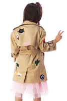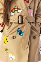 This khaki trench coat features fun patches all over, adding personality to any outfit. Lightweight and comfortable, it’s perfect for layering and everyday wear.