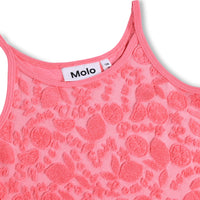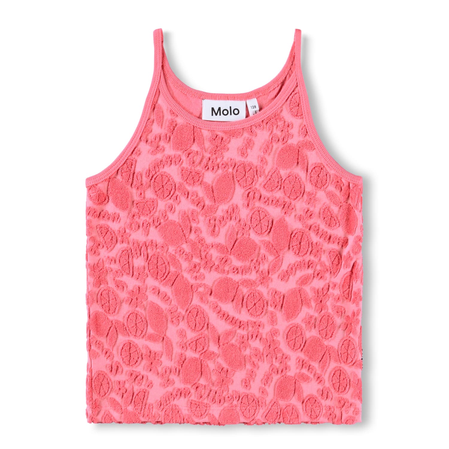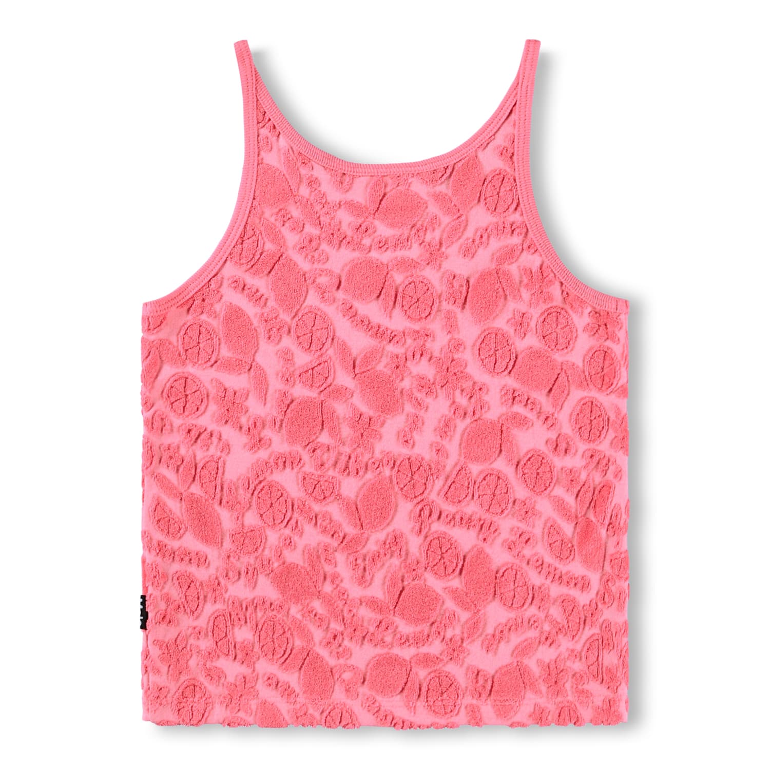 Pink top with a pattern of citrus fruits made of soft cotton terry. The top is loose, with narrow straps.