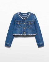 This stylish girl’s denim jacket in blue indigo is a perfect mix of classic and modern fashion.