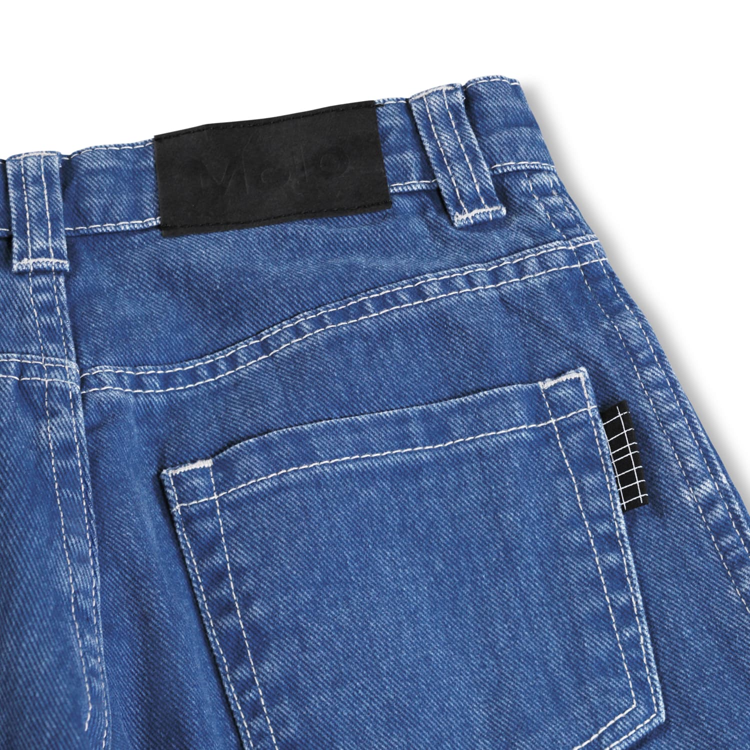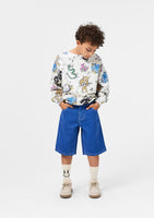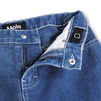 Blue knee-length denim shorts in organic cotton. The shorts have pockets at the front and back, a snap button and zip at the front, and belt loops. From size 92-134, the shorts have an internal button for adjusting the waist to ensure an optimal fit and longer wear. The shorts have a washed blue appearance.