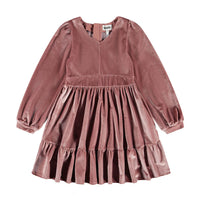 Knee-length rose velour dress with long sleeves and a V-neckline. The dress has a wide waistband for a close-fitting silhouette, while the ruffle skirt falls beautifully in the soft velour. The invisible zipper makes the dress easy to put on.