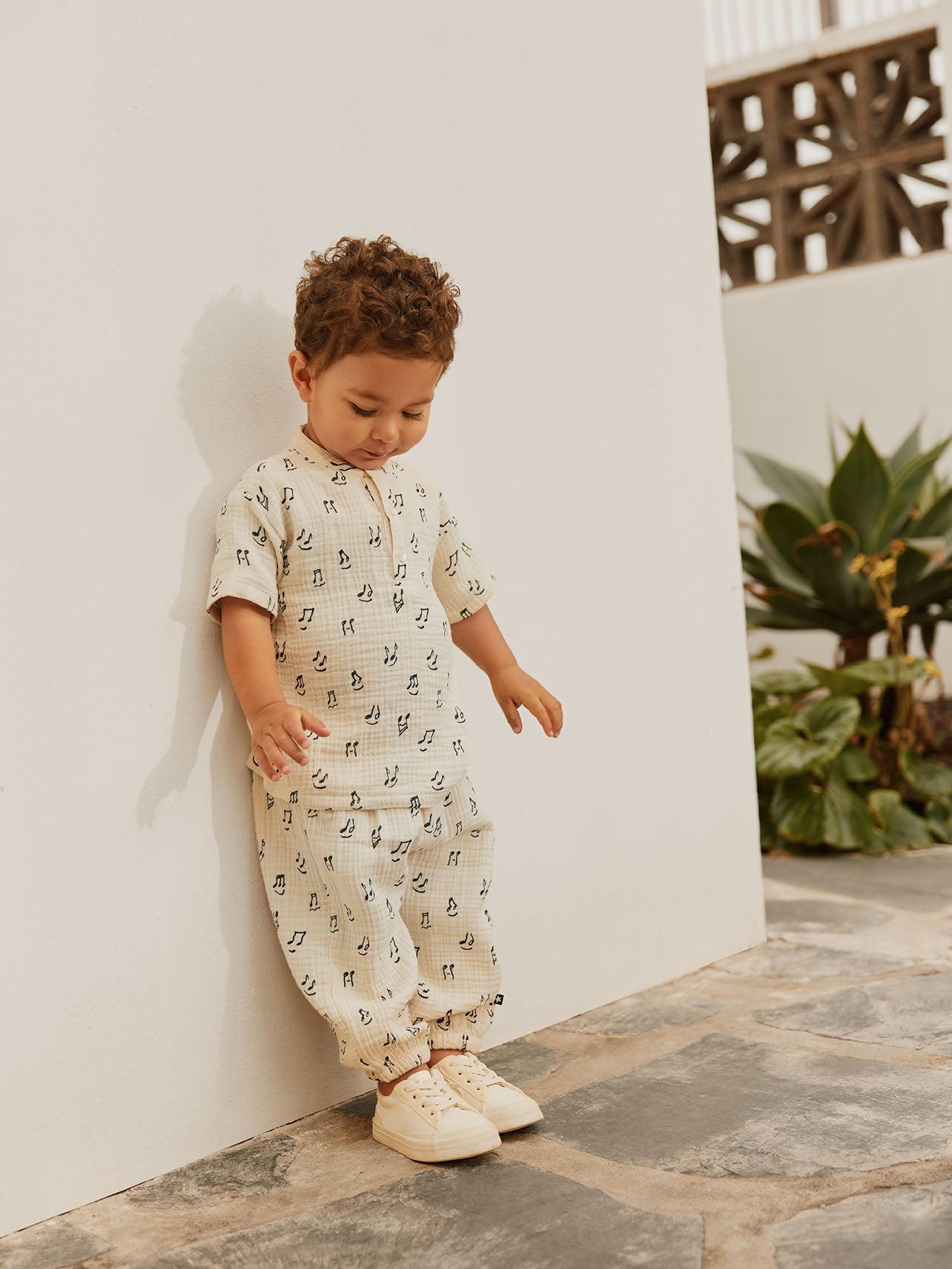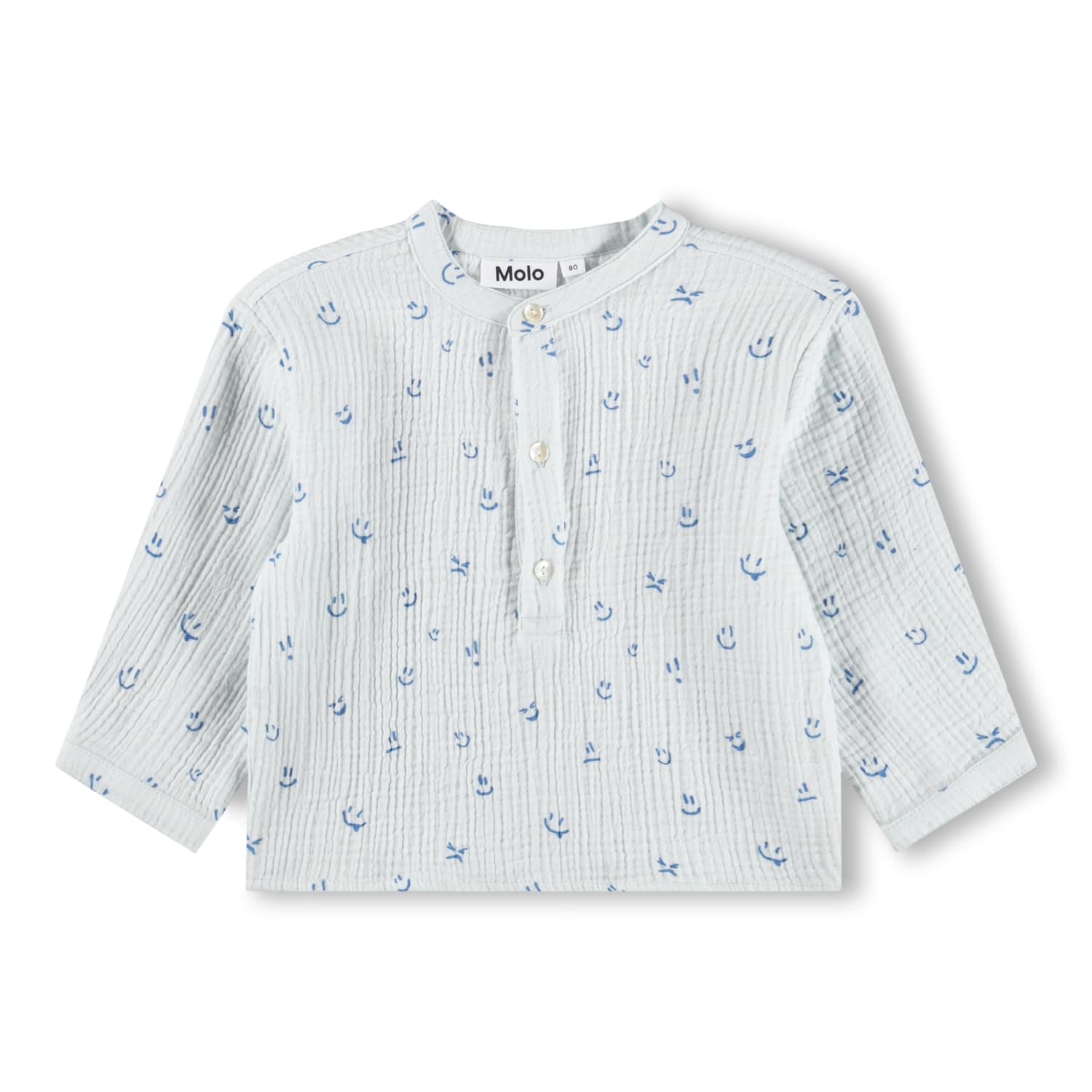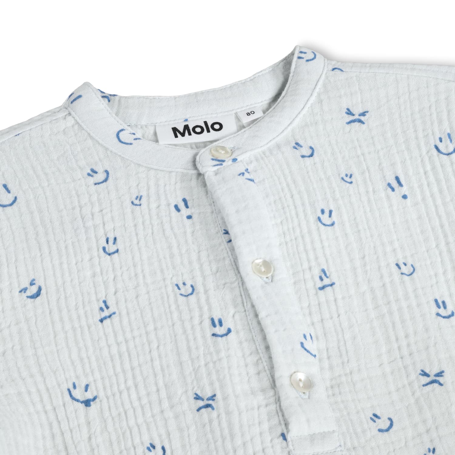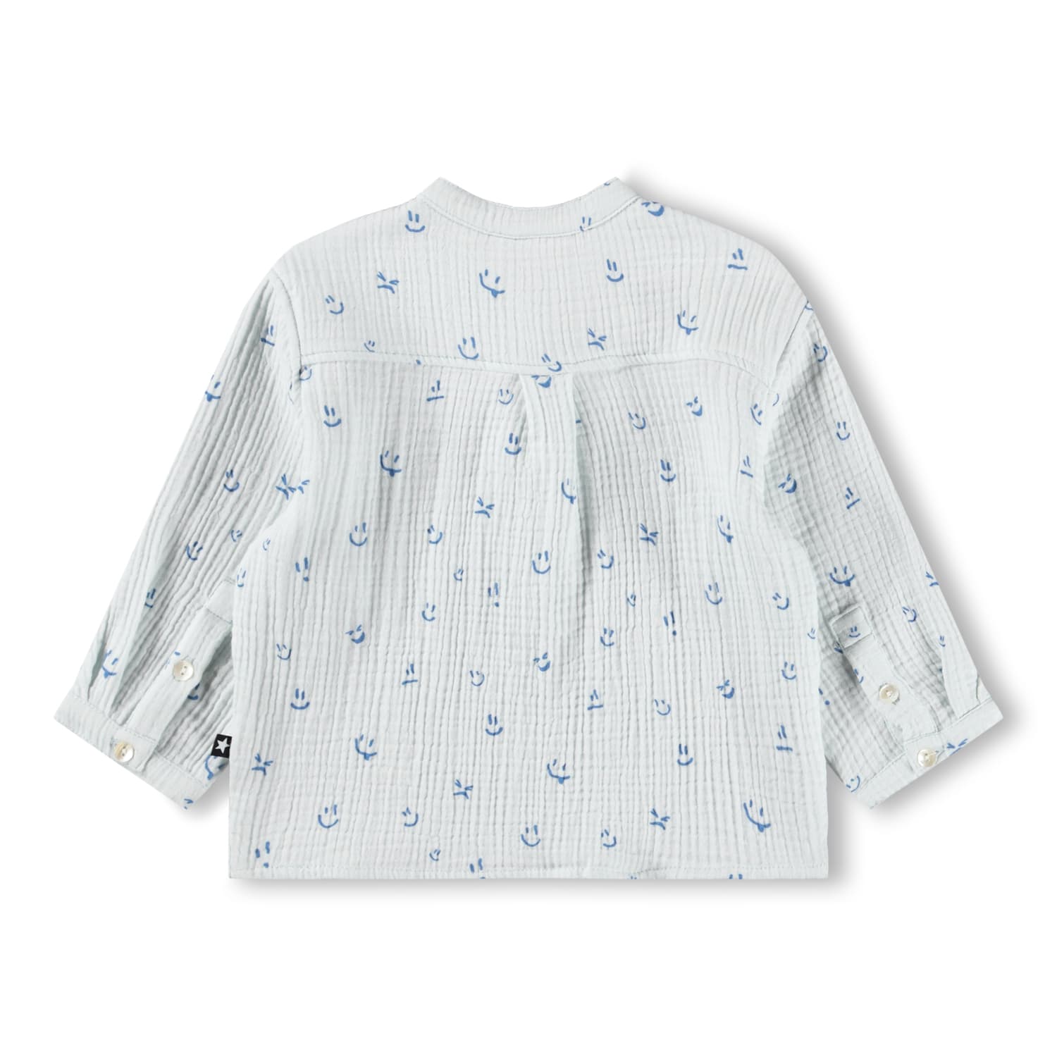 Long-sleeved, blue shirt & pant with a happy print made of soft, organic cotton muslin for the little ones. The shirt has a soft, round collar and button fastening at the front which makes it comfortable and easy to put on and take off.