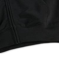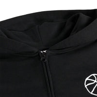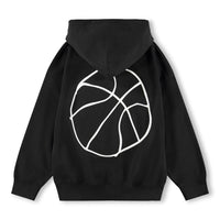 Black hoodie made of soft cotton with a kangaroo pocket, front zip and ribbed edges at the sleeves and bottom. The hoodie has a loose, relaxed fit and is embroidered with a white basketball on the chest and back.