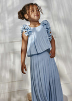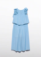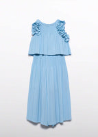 Elevate her wardrobe with this elegant two-piece ensemble. Crafted from lightweight, finely pleated chiffon, this set features a sleeveless crop-style top with dramatic ruffle shoulders and matching wide-leg flowy trousers. Perfect for special occasions, summer parties, or photo shoots.