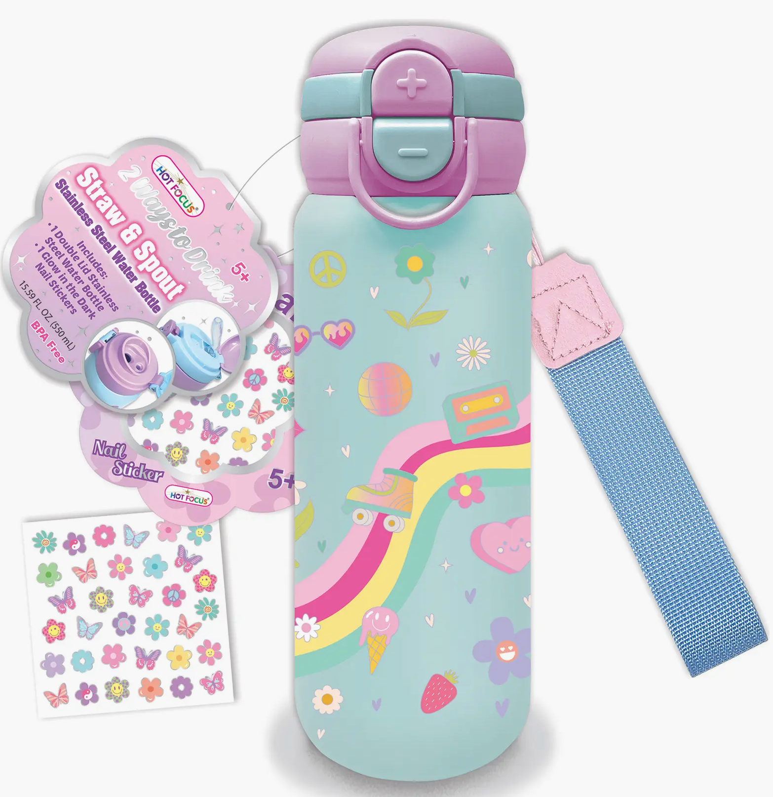This delightful water bottle boasts a whimsical design, along with user-friendly features like a pop-open function and a secure handle, making it the perfect companion. Contains: 1 Stainless Steel Water Bottle 1 Sheet of Vinyl Stickers
