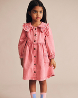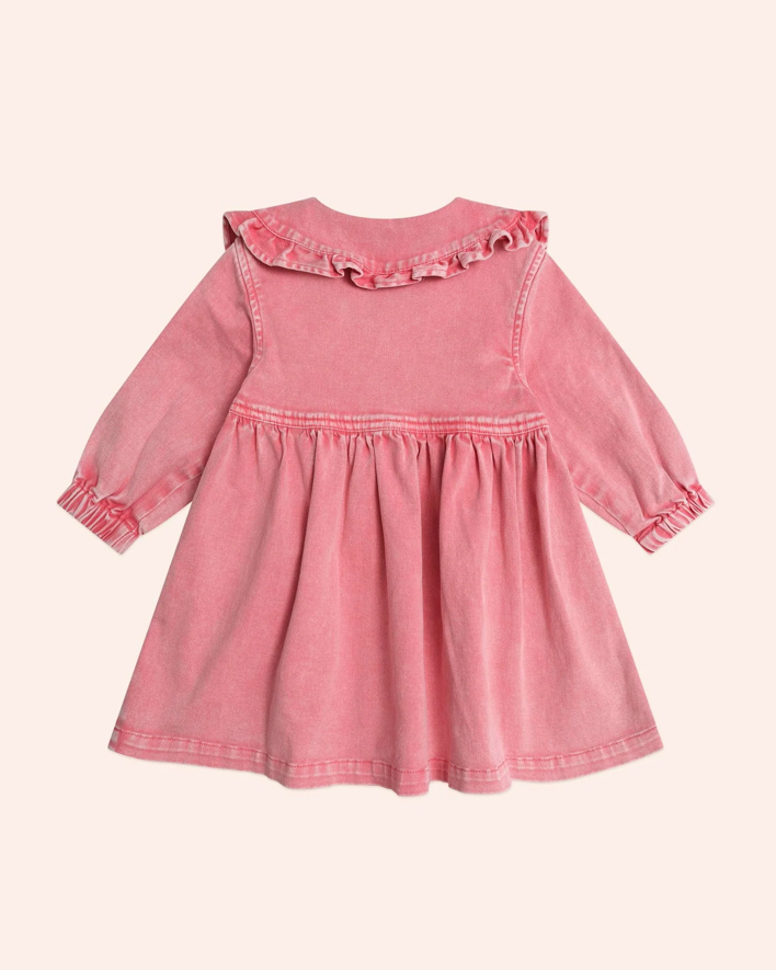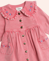 The sweetest classic vintage style frill dress. Made from soft cotton twill, it features a peter pan style frilly collar with floral embroidery detail, button down snaps, a full, tiered skirt and exaggerated puff sleeves.